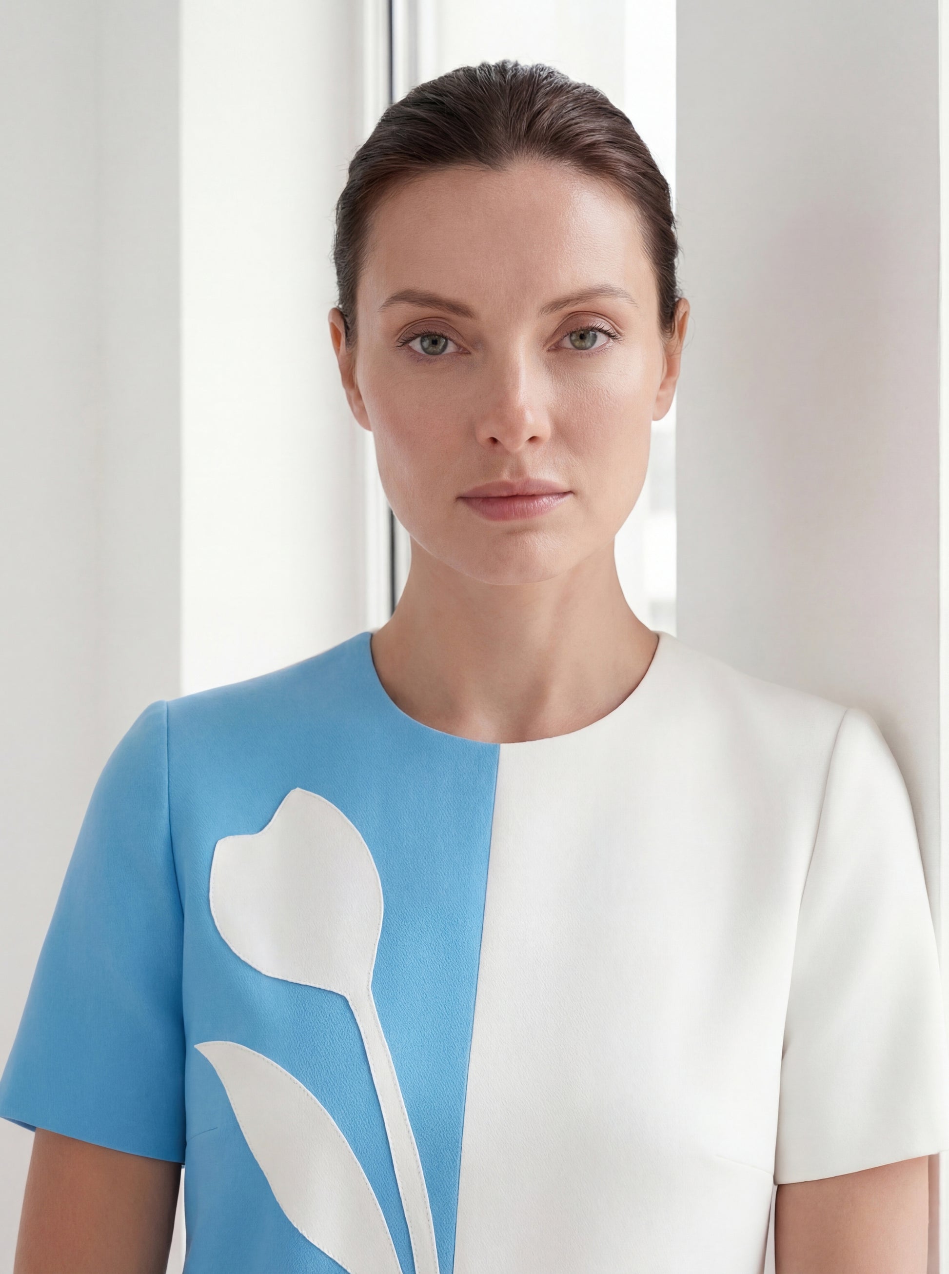 A structured shift in sky blue and white, distinguished by its abstract floral detail. Premium fabric blend. Clean architectural lines. Short sleeves. Designed for women who thrive where they're planted.