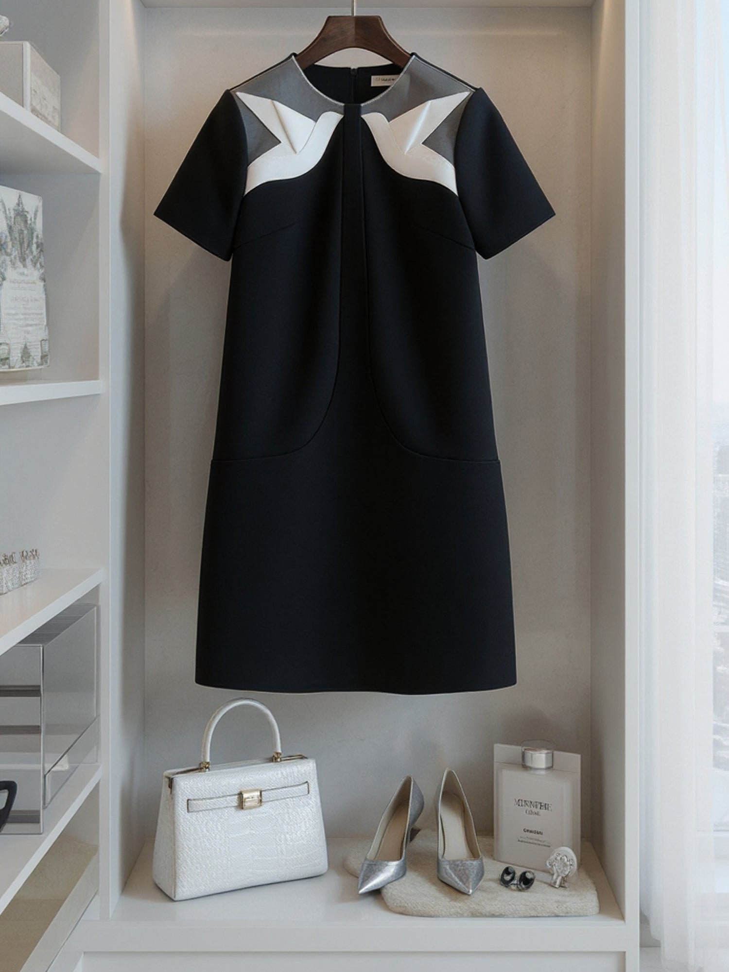 This modern shift dress is crafted from premium structured fabric, designed to fall naturally from the shoulders while maintaining a polished silhouette. It features clean lines and a distinctive neckline with geometric panels and sheer mesh inserts that lend a contemporary edge. Ideal for both professional and elegant daytime settings, this dress blends classic minimalism with striking design elements.