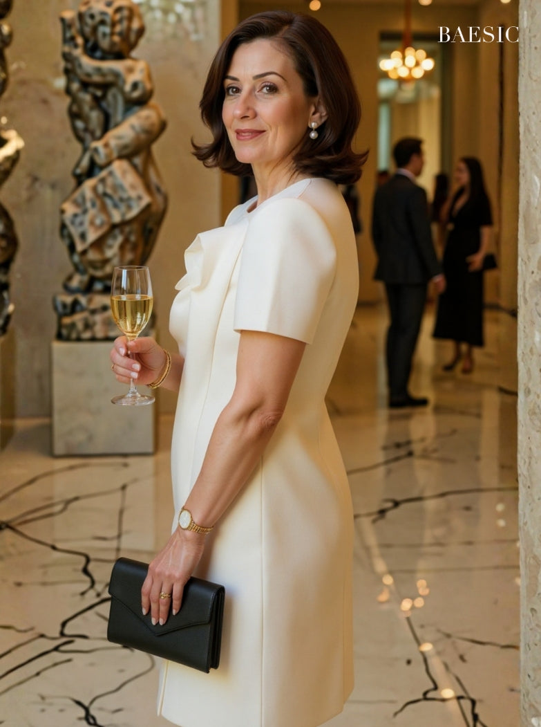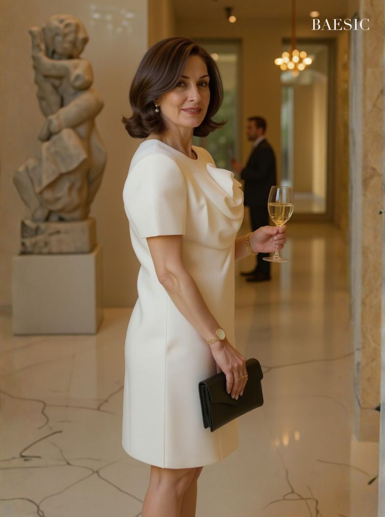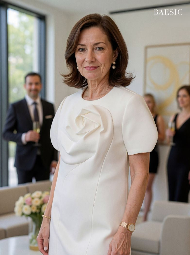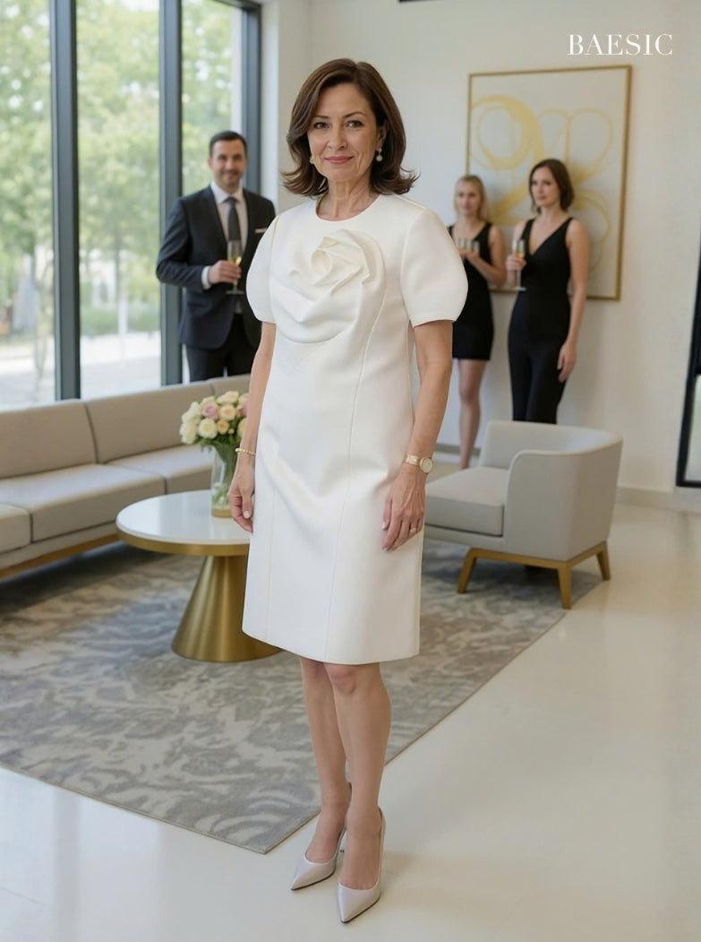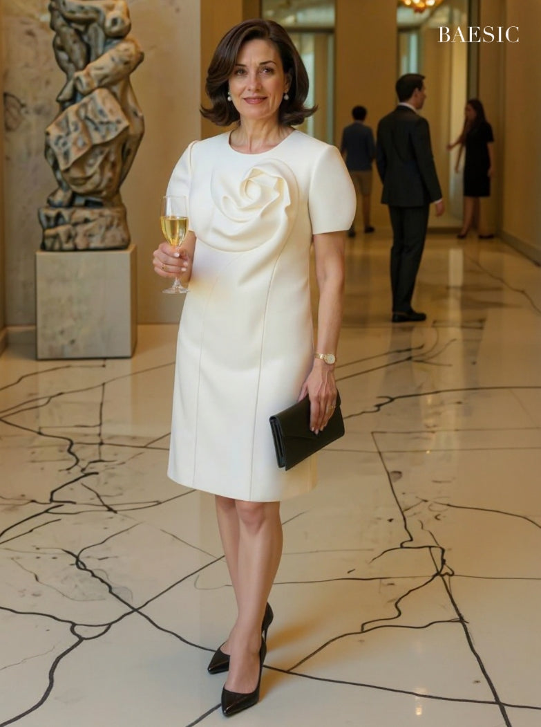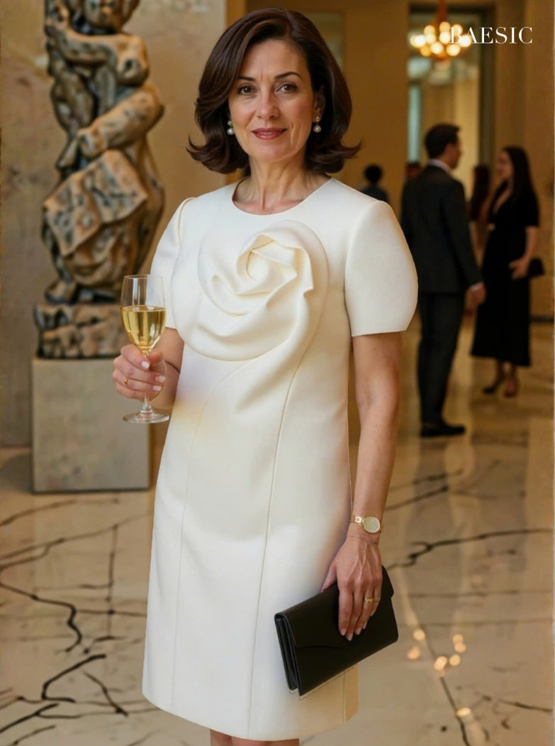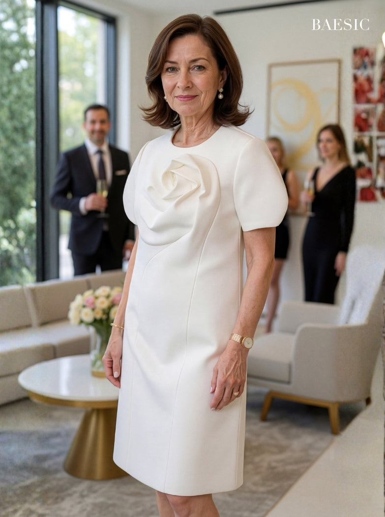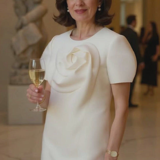 A structured shift dress in white, distinguished by its hand-sculpted rose detail. Premium blend fabric. Clean lines, fluid drape. Short sleeves, concealed back zip. Designed for women who dress with intention.
